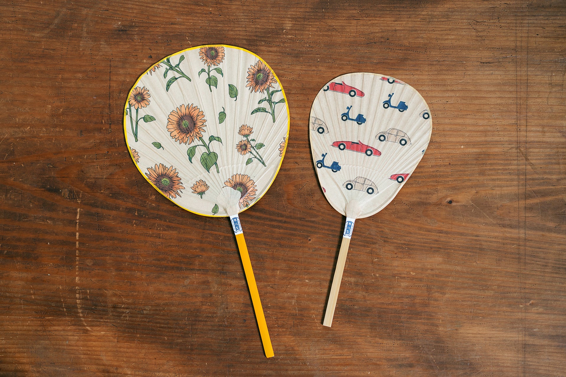 落ち着いた華やかさのあるひまわりの絵柄。天然染料で染めたイエローの持ち手が、涼やかにアクセントを添えています。サイズは一般的なうちわと同じくらいですが、持ち手を長めに仕立てているので、やわらかな風をしっかりと運びます。