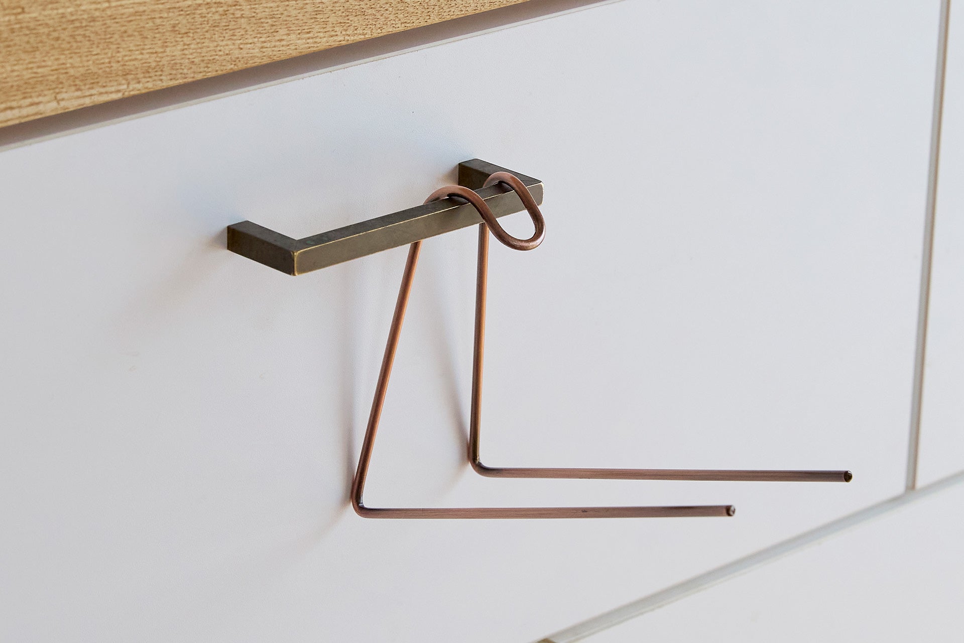 収納棚の取っ手やツールバーなどに引っかけるだけで設置完了。和晒ロールの乾燥はもちろん、和晒コーヒーフィルターを干すのにも便利です。ふきんや小さめのタオルなどにも応用できて、使い道は広がります。