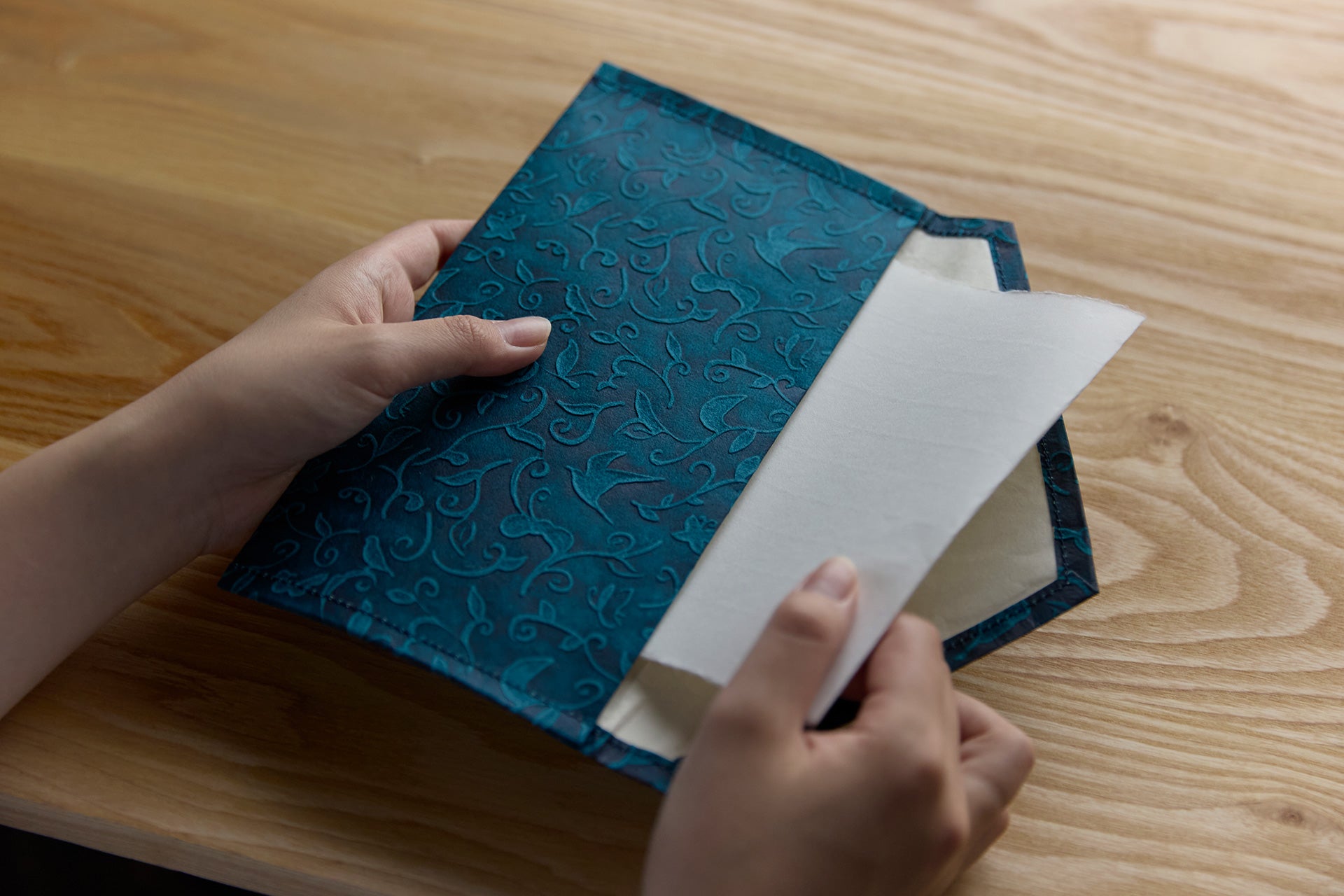 表面には浮き紙を、内側には繊維の長い楮紙(こうぞし)を縫い合わせて仕立てられており、やぶれにくく強度があるため、長く愛用できるアイテムです。